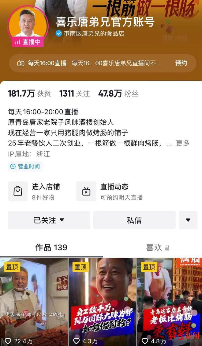 唐健的朋友崔先生告诉红星新闻记者,2000年的时候,唐健在青岛市做餐饮生意风生水起,后来他投资绿化工程“陷进去”了,资金窟窿越来越大,“当初我们很怕他想不开,2015年他还去崂山上面住了一段时间,自己也把事情想明白了。后来他开始卖烤肠,2020年我建议他试一试直播,开拓线上生意。当时他很兴奋,告诉我第一场直播卖出了100多单。”