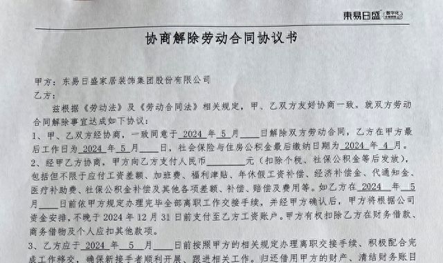 据李红表述,直到今年5月初,在工资拖欠情况持续近半年后,东易日盛的一些部门的中层领导带着一份《协商解除劳动合同协议书》,开始与员工面谈离职事宜。