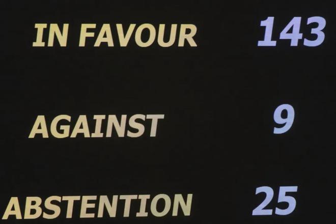 当地时间5月10日上午,应多国要求,联合国大会第十届紧急特别会议恢复举行。会议审议了接纳巴勒斯坦为联合国新会员国的议题,并通过了授予巴勒斯坦更多权利的决议。表决中,193个会员国以143票赞成,9票反对,25票弃权的绝对多数通过了决议,美国、以色列等投票反对。