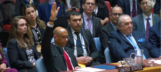 在投票前,会场发生了颇具戏剧性的一幕。以色列驻联合国大使埃尔丹举起哈马斯军事领导人叶海亚·辛瓦尔 (Yahya Sinwar) 的照片,上面写着“总统”一词,随后用一台小型碎纸机粉碎《联合国宪章》,以表示不满。