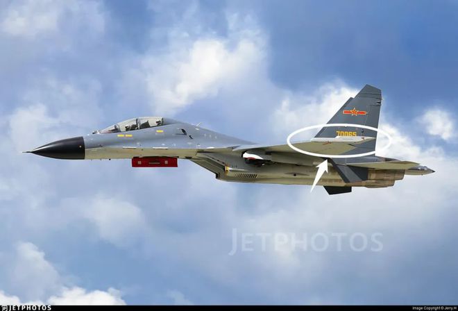 而歼-15B型战斗机的翼尖导发架,似乎和之前所有歼-11平台的翼尖导发架全然不同,甚至和俄罗斯苏-27、苏-30平台的翼尖导发架也有不同。一方面是长度相当长,从照片上看似乎比歼-16的导发架还要长一些;另一方面是外形比较特殊,中后部直径比较大,前部有一段直径似乎比较小,不清楚如此设计的原因为何。大佬的解读是这可能是一种新型的通用导发架,大伊万认为有这种可能性。