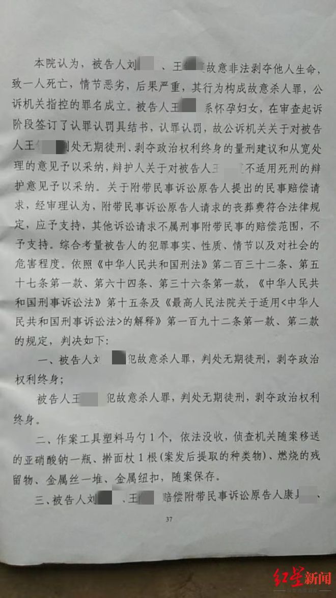 2023年4月21日,定西市中级人民法院以故意杀人罪,一审判处王某霞、刘某军无期徒刑。而就在前一年的6月26日,王某霞产下一男婴,经鉴定孩子的父亲是其情人刘某军。面对法院的判决,康某喜家人曾上诉,认为刘某军量刑过轻,但最终被甘肃高院驳回。康某喜的哥哥康银喜告诉红星新闻记者:“刘某军要是判死刑,民事赔偿我们就不要了,但现在是无期徒刑,我自己家庭条件也不好,实在承担不起养孩子的责任,所以需要刘某军民事赔偿。”