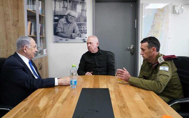 当地时间2024年3月7日,以色列总理内塔尼亚胡(左)与以色列国防部长加兰特(中)及以色列国防军总参谋长哈莱维举行会议。(图源:以色列国防部)