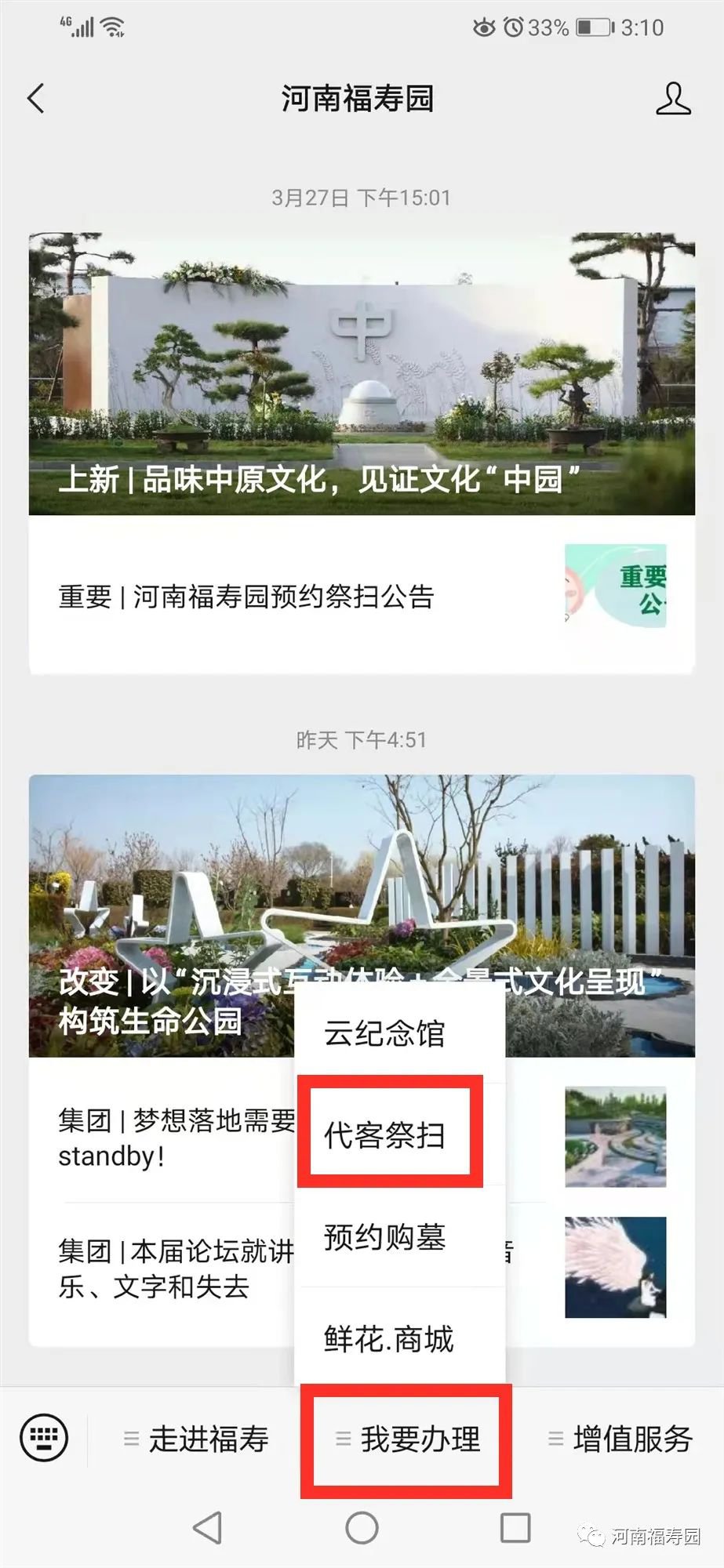关注“河南福寿园”微信公众号,进入“我要办理”-“代客祭扫”,按要求填写相关信息提交服务需求。
