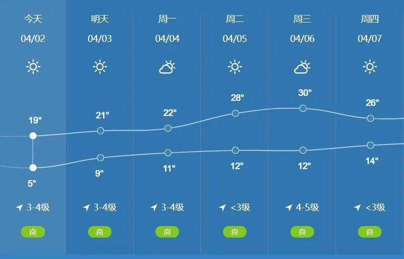清明假期全省天气预报情况为:3日,全省晴天间多云,偏南风3~4级,北部阵风6级,最高温度19℃~21℃,最低温度7℃~9℃;4日,全省晴天转多云,偏南风4级左右,北中部阵风6~7级,最高温度21℃~23℃,最低温度9℃~11℃;5日,全省晴天间多云,偏南风3~4级,北部阵风6级,最高温度北中部25℃~27℃、其他地区22℃~24℃,最低温度10℃~12℃。