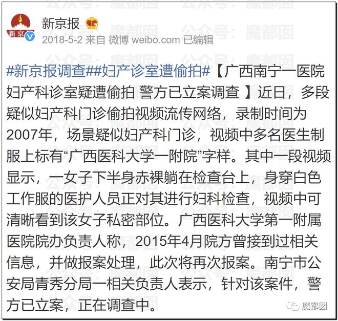 多段网络流传视频录制时间为2007年,场景疑似妇产科门诊,视频中多名医生制服上标有“广西医科大学一附院”字样。其中一段视频显示,一女子下半身赤裸躺在检查台上,身穿白色工作服的医护人员正对其进行妇科检查,视频中可清晰看到该女子私密部位。