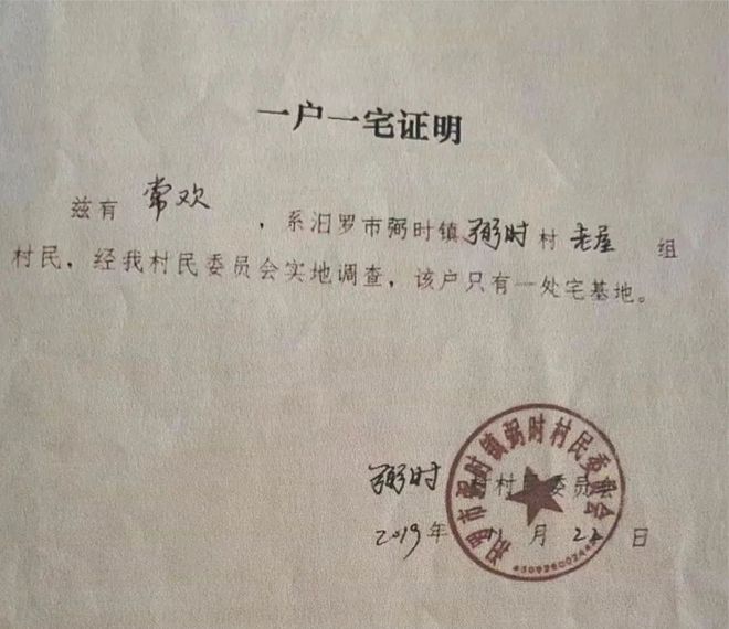 常欢申请建房用地时,村委会开具的“一户一宅”证明