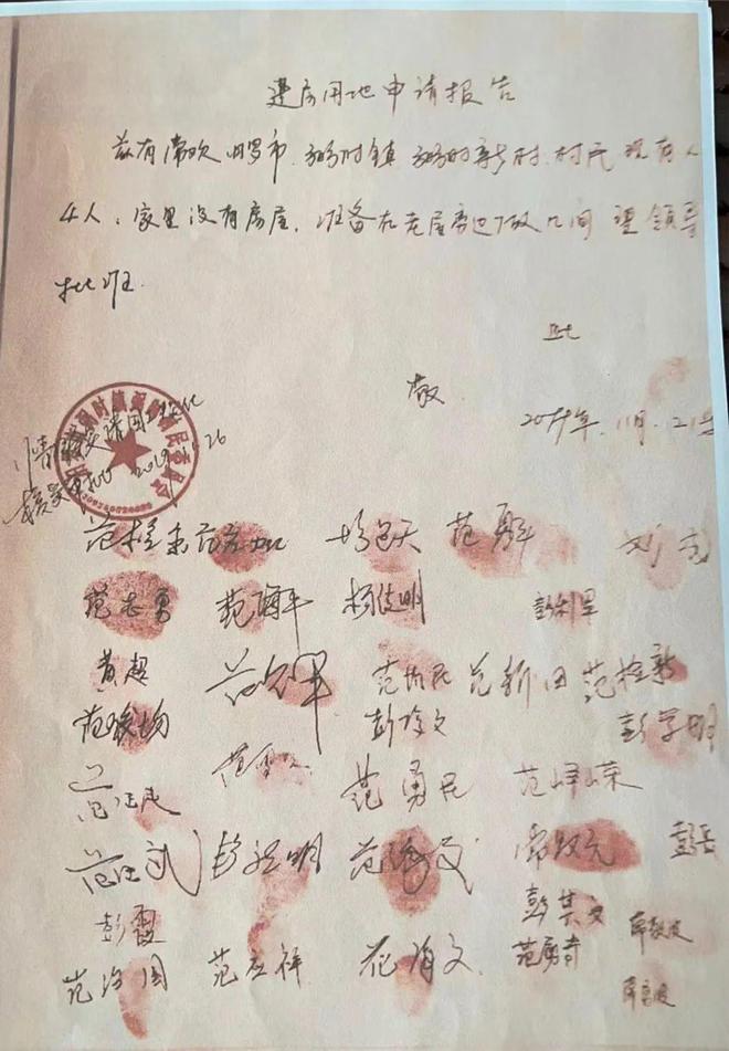 “但是家里有儿子的,女儿不能在这边建房”,聂磊说,由于当地有这样的说法,因此在申请用地时,他挨家挨户去跟邻居们解释自己“在老家没房没地”的特殊情况,其提供的一份《建房用地申请报告》显示,村小组40户人家,有30余人签字并按了手印表示同意。