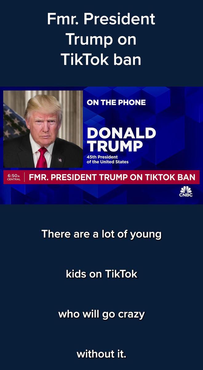 继3月7日扔出一记“回旋镖”,在社交媒体上发文反对封禁TikTok后,此前曾对TikTok穷追不舍的特朗普在3月11日接受美国消费者新闻与商业频道(CNBC)采访时又声称,尽管TikTok构成所谓“国家安全风险”,但封禁这款应用程序只会“便宜了脸书”。“没有TikTok,会让脸书变得更强大,我认为脸书是人民的敌人。有很多人喜欢TikTok,TikTok上有很多小孩,他们没有了TikTok会发疯”。