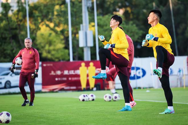 门将颜骏凌、刘殿座在训练中。国足交锋澳大利亚、印尼,要把重点放在整体防守层面