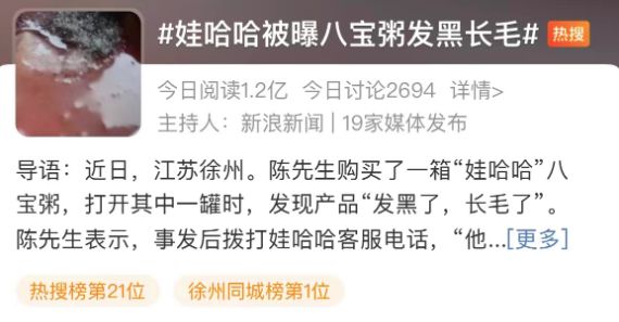 然而复兴不过两天,紧跟着,娃哈哈就被曝八宝粥发黑长毛上热搜。