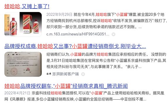 2年后看到元气森林的火爆,娃哈哈也推出气泡水小蓝罐柠檬茶,盲目进行品牌授权,营销手段卷土重来,不少入局者先交钱,成为小蓝罐的经销商,却发现收钱不发货被骗数百万。深陷争议,这款产品最终被迫停产。