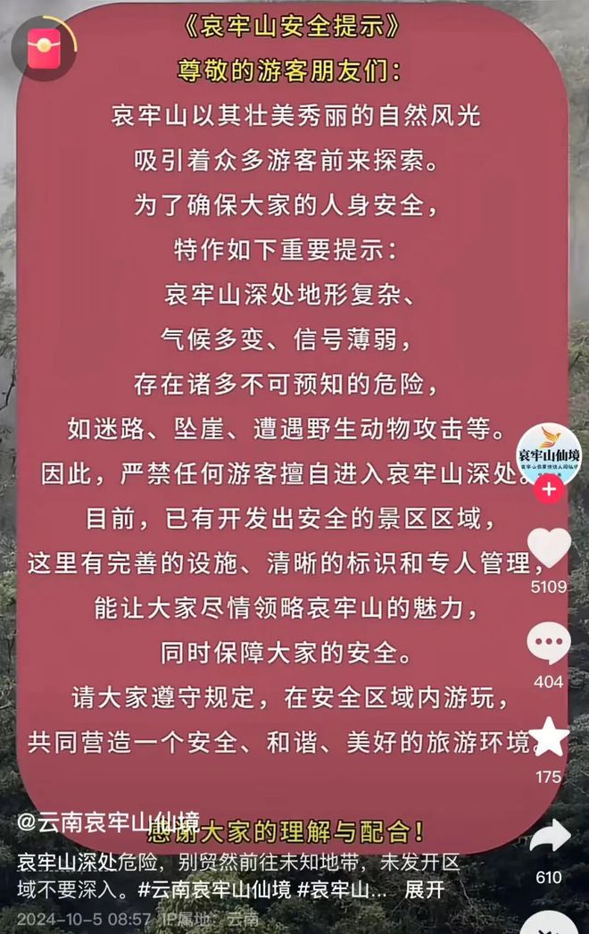 10月5日,@云南哀牢山仙境 发布安全提示:未开发区域不要深入!