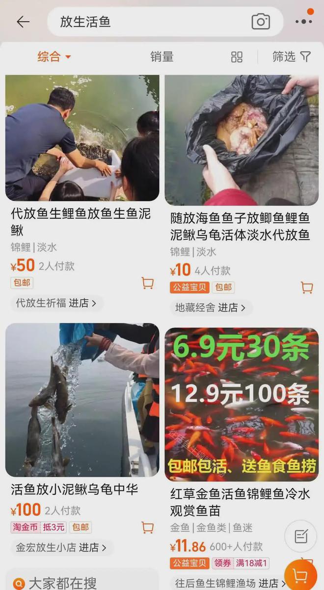 “现在不太好找代放生的人家了,网上都屏蔽了!”正如张亚茹所言,在淘宝搜索“放生”,会出现一个弹窗画面,写有“非法放生和遗弃将承担法律责任”的警示语。但搜索具体要放生的种类,如“放生活鱼”或“放生乌龟”,还是会出现代放生的商家。