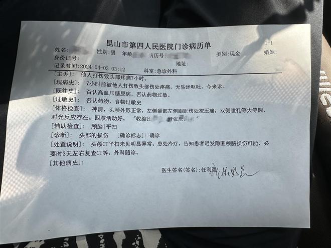 “永康大队长”称,事发餐馆位于昆山市光明路909号,打他的黑衣男子是这家餐馆的老板。他提供的就诊病历显示,4月3日凌晨3时许,他被诊断有头部损伤,头颅CT平扫未见明显异常。医生告知了他迟发隐匿颅脑损伤可能,必要时3天左右复查CT等。他告诉记者,警方告知他等4月8日到医院复查,届时将处理此事。