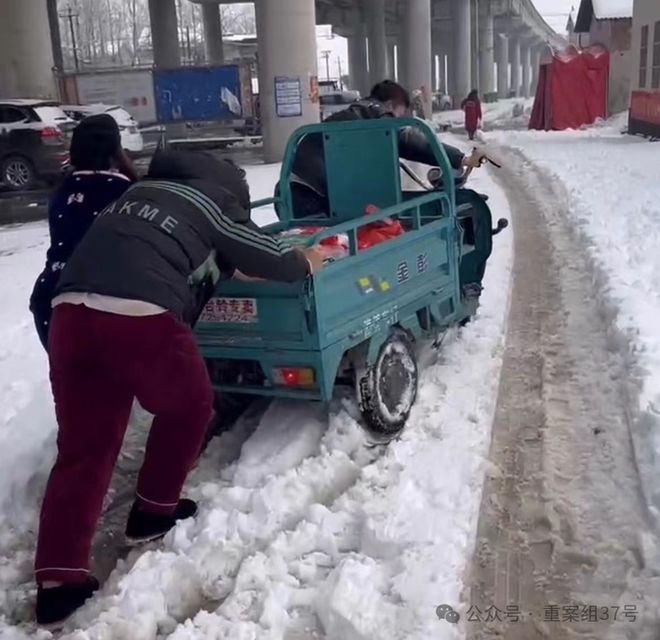 小卖部到桥下不过5分钟,雪积得厚,路面又结了冰,吴佳雯抱着泡面,稍不注意就打个滑。苏俊杰骑的三轮车也陷在雪里,几个人在后面用力推。