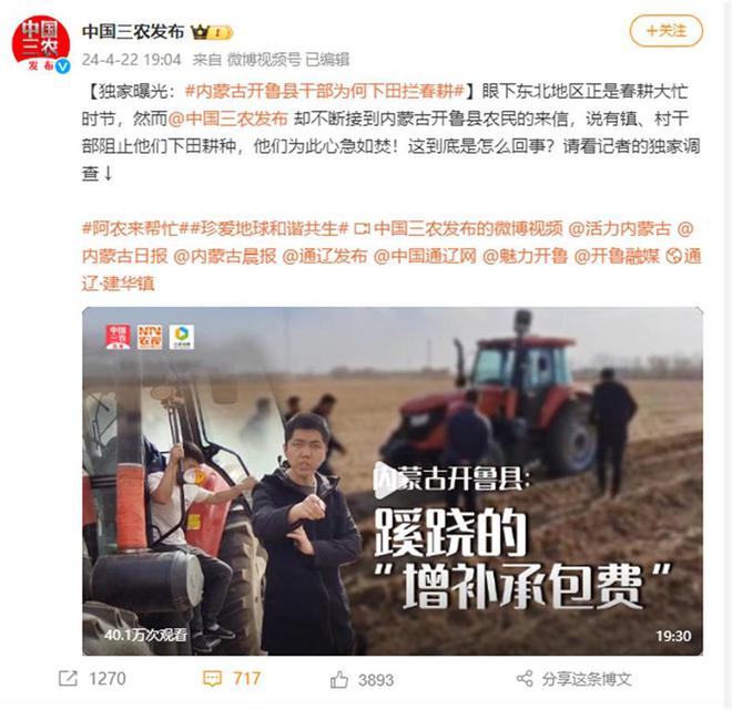 4月22日,据“中国三农发布”报道,内蒙古自治区开鲁县多位种植户反映,有镇、村干部阻止他们下田耕种,种地要交钱,而此前他们已签订了土地承包合同。媒体曝光此事后,当地已成立工作组就此开展调查。23日,当地纪委监委工作人员回应极目新闻记者称,已关注到此事,正在核实涉事村镇干部是否存在违法违纪问题。
