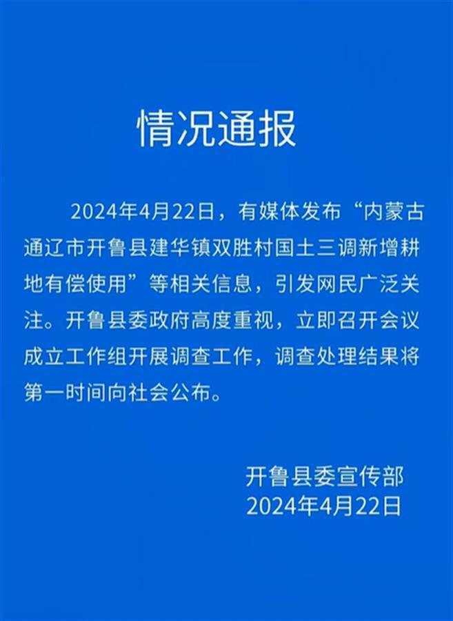 针对此事,23日上午,通辽市12316“三农”服务热线工作人员回复极目新闻记者称,4月22日,有媒体发布“内蒙古通辽市开鲁县建华镇双胜村国土三调新增耕地有偿使用”等相关信息,引发网民广泛关注。开鲁县委、县政府高度重视,立即召开会议成立工作组开展调查工作,调查处理结果将第一时间向社会公布。热线工作人员回复的内容,与开鲁县委宣传部发布的《情况通报》一致。