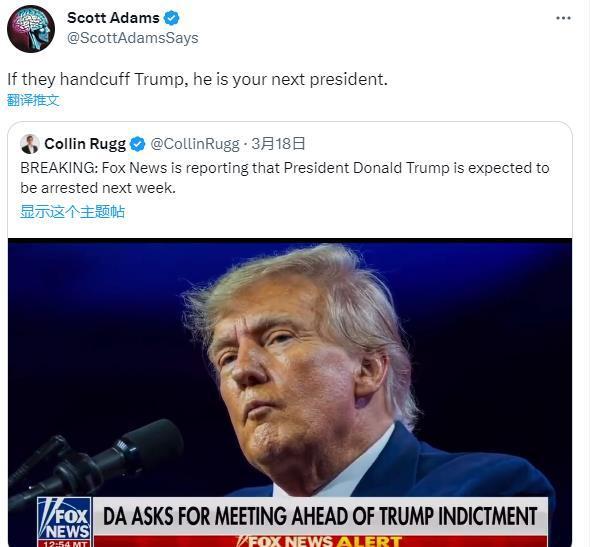 美国知名漫画家斯科特·亚当斯也赞同马斯克的观点,即特朗普被起诉反而会提高他在美国大选中的获胜机会。“如果他们给特朗普戴上手铐,他就会成为你们的下一任总统,”亚当斯说。