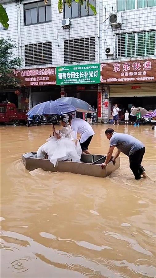 视频中,洪水没过街道,一位身穿白色婚纱的新娘坐在小船上,撑着伞。一名身穿白色衬衣、西装裤的男子一只手撑伞,一只手扶稳着小船,在旁边走。船后,还有一名男子在淌水往前推船。视频中,水没过了几人的膝盖。