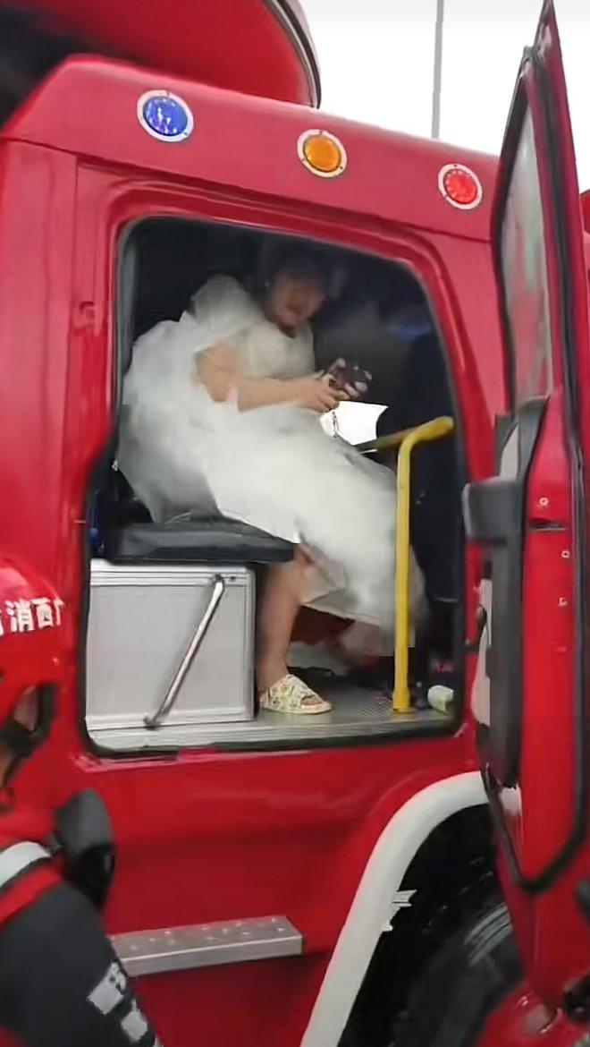 广西一新娘洪水中坐船结婚,消防车当婚车?当地回应:消防员顺路接送新娘后投入救援