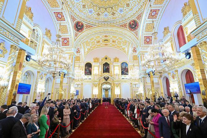 7日上午,莫斯科飘起大雪。临近正午,普京从总统官邸办公室出发,乘坐俄国产Aurus总统专车抵达大克里姆林宫,于门廊听取克里姆林宫警卫长的报告。随着12时整的钟声响起,普京从圣乔治大厅和亚历山大大厅的宾客身旁走过,进入安德烈大厅。