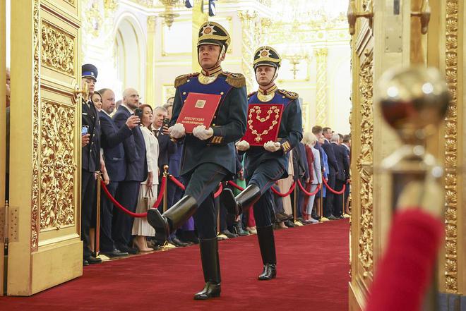 仪仗队士兵手捧俄罗斯宪法以及总统标志进入就职典礼举行地