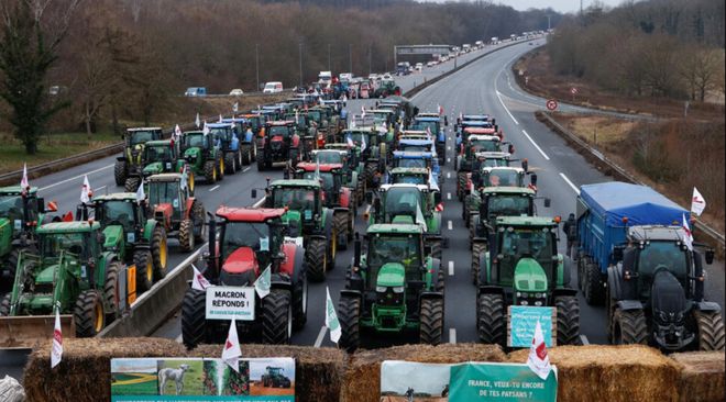 1月31日,大约1万名法国农民加大抗议力度,法国各地主要道路上至少有100处地点被封锁。美联社称,农民们向政府办公室泼粪便,用拖拉机和干草堆阻碍交通,“包围”巴黎。抗议者弗兰克·查登试图用新鲜出炉的羊角包向警方“行贿”,并自卖自夸道:“这是用法国面粉做成的羊角包,品质一流。”他要求警方打开警戒线,让拖拉机过去。过去一周,农民的拖拉机车队一直封锁巴黎交通要道,被称为“巴黎围城”。