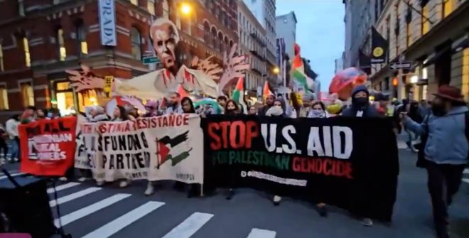 还让不让普通过节民众好好买东西了?看来,起码那些抗议者是不想让!打出的标语是“当你购物时炸弹正在投下”。