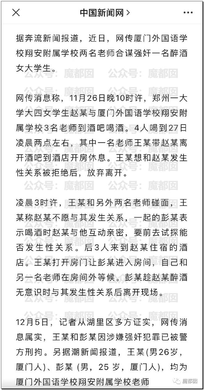 女生应该先认识王某,所以王某最先对女生有歹念,觉得时机到了,可以了,然后开房后未果,可能此时女生还没醉的那么厉害,万万没有想到,王某后续竟然会把这个女生“让给”同事彭某,竟然让彭某“接力”成功,而王和洪就在门口等待……这还是人吗?这还是为人师表的老师?3人同一学校,学校是好学校: