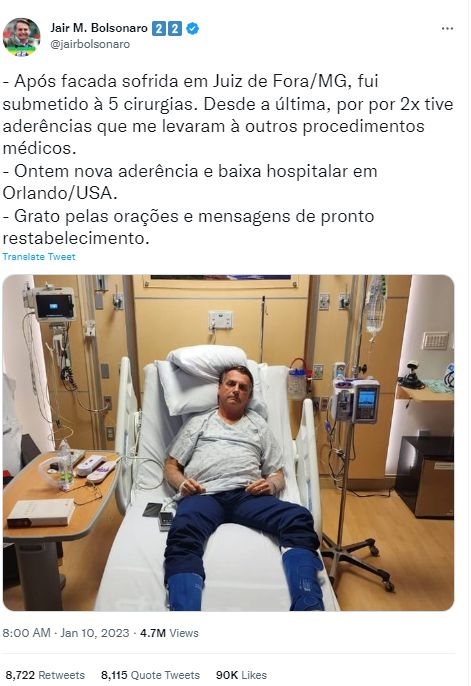 处在舆论中心的博索纳罗正因腹部不适而在美国佛罗里达州奥兰多市郊外的一家医院接受观察,他9日在推特上发布了一张自己躺在病床上的照片。博索纳罗的妻子米歇尔当天称,此次腹部不适是博索纳罗2018年总统竞选期间遭遇持刀袭击留下的旧伤所致。