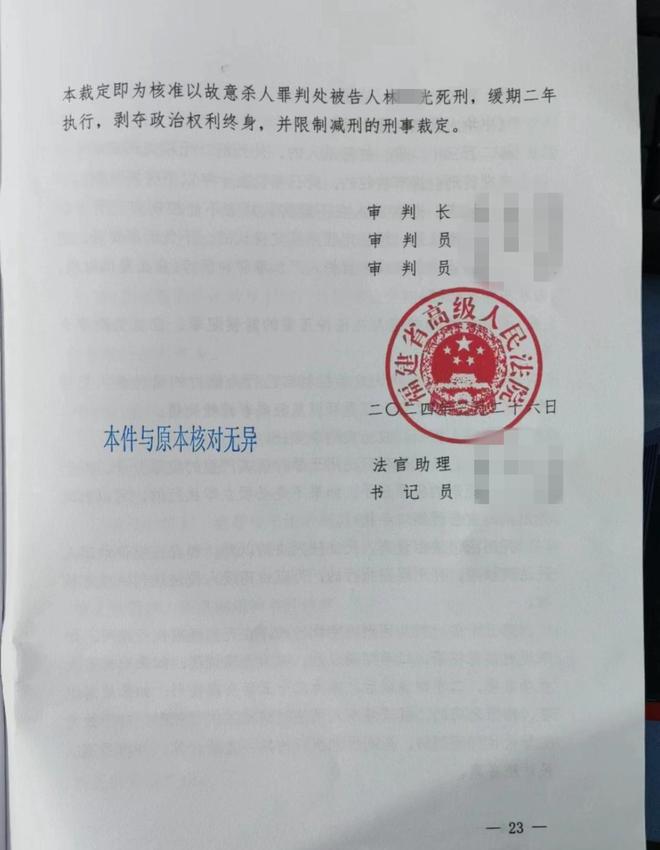 林某光一审被判处死刑缓期二年执行后,被害人家属当庭提出上诉。4月9日,被害人家属吴女士告诉封面新闻记者,她当天收到了二审判决书,维持一审判决,“我们家属对判决不服,准备走再审申请。”