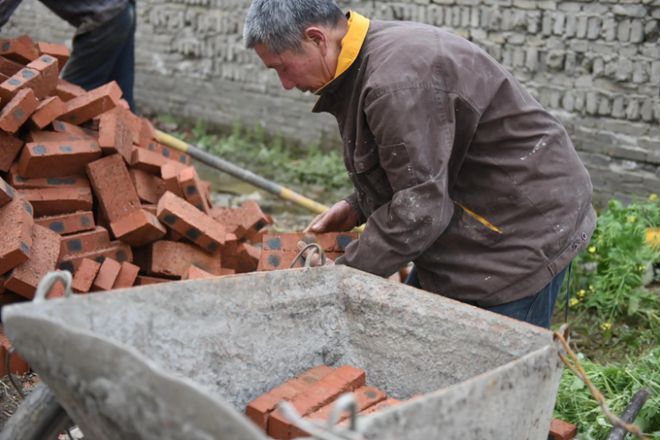 刘珈辰想着帮一帮爸爸的忙,但是仅仅只是搬了十块砖之后,她就累得筋疲力尽了。
