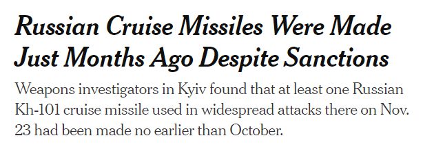 美国《纽约时报》5日称,通过对掉落在基辅附近的俄军Kh-101导弹残骸的分析,情报人员认定它们的生产时间最晚可以追溯到9月之后,显示西方对俄罗斯的严厉制裁并没有影响俄军导弹的继续生产。
