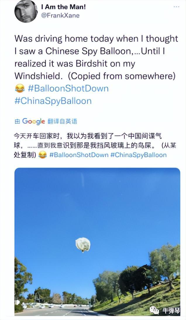 最神奇的,还是美国人的这个段子,看了一下,在社交媒体上广为流传:今天开车回家时,我以为看到了一个中国间谍气球,恐惧了老半天,最后才发现,这不过是我挡风玻璃上的一块鸟屎……