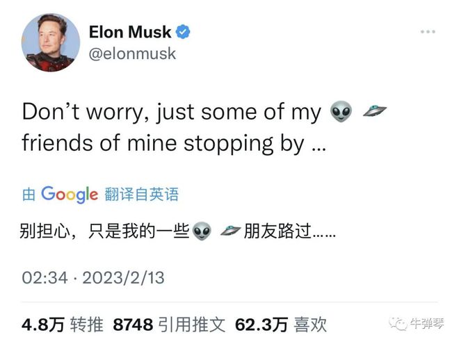 世界首富马斯克就公开调侃:“别担心,那只是我的一些朋友路过……”喜欢搞怪的他,还附上了外星人和UFO的表情符号。
