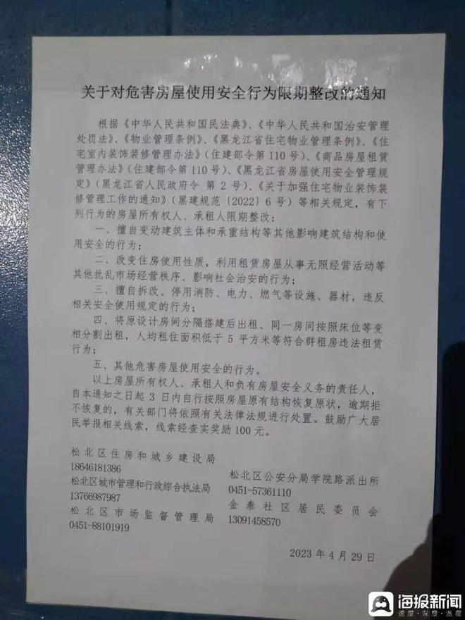 松北区住建局、城管局、市场监管局、辖区派出所以及社区于4月29日联合下发的《关于危害房屋使用安全行为限期整改的通知》