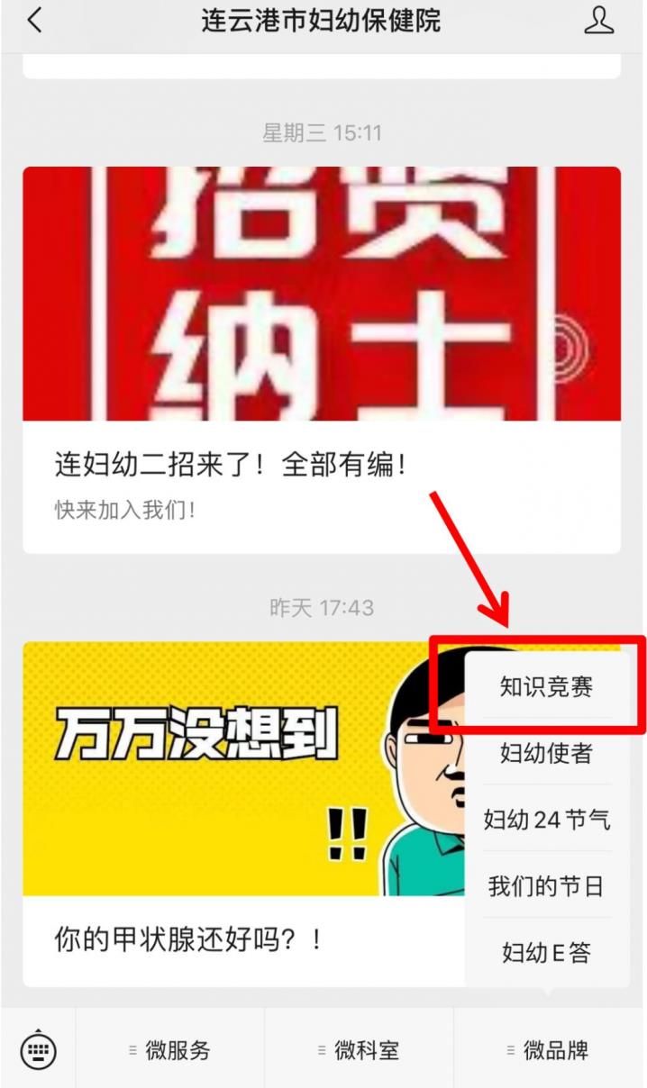 02进入连云港市妇幼保健院微信公众号菜单栏“微品牌——健康节知识竞赛”参与!(页面图解)