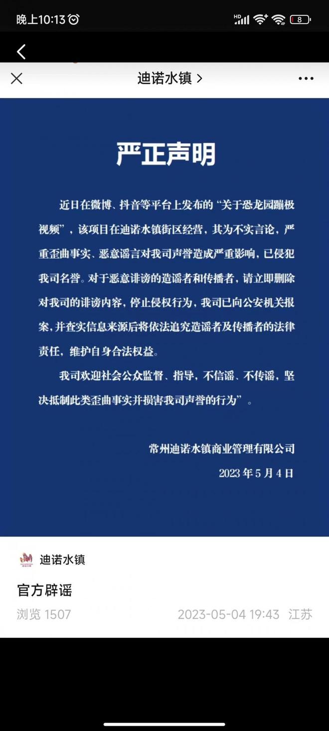 5月4日晚,艾酷极限蹦极俱乐部所处的“迪诺水镇”发布声明:“近日在微博、抖音等平台上发布的‘关于恐龙园蹦极视频’,该项目在迪诺水镇街区经营,其为不实言论,严重歪曲事实、恶意谣言对我司声誉造成严重影响,已侵犯我司名誉。对于恶意诽谤的造谣者和传播者,请立即删除对我司的诽谤内容,停止侵权行为,我司已向公安机关报案,并查实信息来源后将依法追究造谣者及传播者的法律责任,维护自身合法权益。”