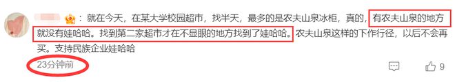 3月2日,一位网友表示在某大学校园超市里找了半天,最多的就是农夫山泉。网友在第二家超市不显眼的地方才找到了娃哈哈。感慨“有农夫山泉的地方就没有娃哈哈”“农夫山泉这样的下作行为,不会再买”。