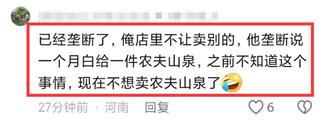 一位超市老板还爆料了内幕,称农夫山泉进行市场垄断,不让卖娃哈哈。不卖娃哈哈和其他瓶装水的,白给一个月农夫山泉。