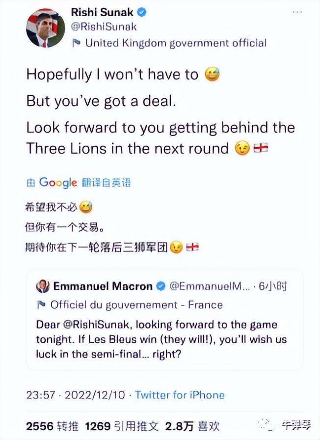 在开赛之前,马克龙在推特上直接@苏纳克说:“亲爱的里希·苏纳克,期待着今晚的比赛。如果法国队赢了(他们会的!),你会祝我们在半决赛中好运的......对吗?”