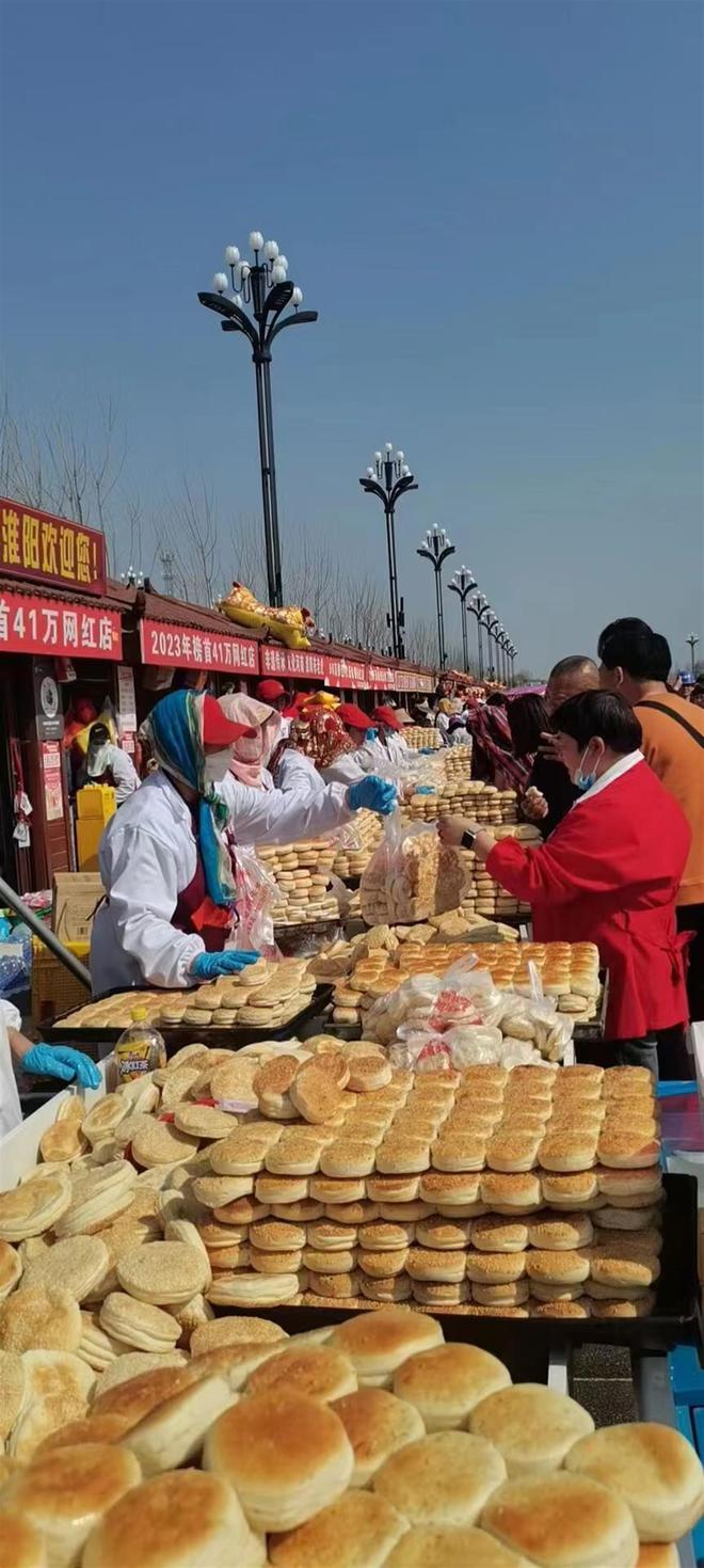 “那真是人挨着人……”广场上商户介绍,来庙会的人非常多,根本走不动。压缩馍经营户一天要用掉数十袋面粉,卖出数万个馍。大的经营户,光从作坊来往广场运馍的工人就要十来个。