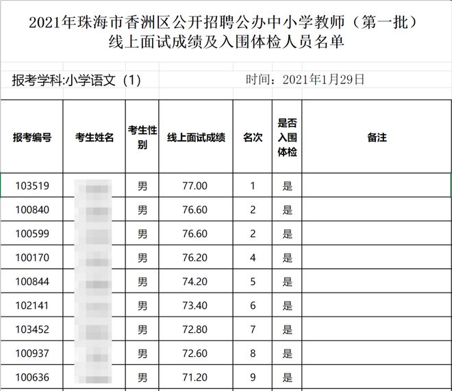 2021面试成绩。据珠海市香洲区教育局官网截图