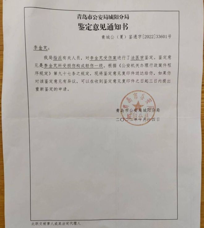9月16日,孩子家人拨打了报警电话。随后警方调取了健身房的监控视频。根据王女士提供的材料显示,青岛市公安局城阳分局10月14日作出的《鉴定意见通知书》,该分局对小李伤势进行了法医学鉴定,鉴定意见小李所受损伤构成轻伤一级。
