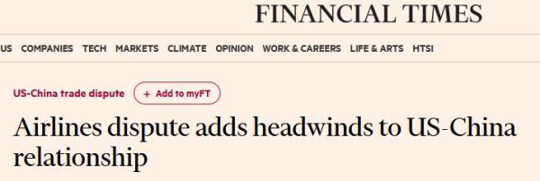 FT报道称,有6名知情人士透露,美国已提出给予中国航司与美国航司相同的每周往返航班数量,但以此作要挟——前提是,要求中国航司必须同意赴美航班不飞越俄领空。