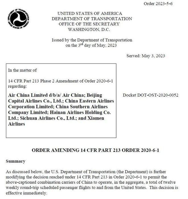 【环球时报报道 记者 赵觉珵 涂蕾】美国交通部当地时间3日发布指令称,批准中国的航空公司将每周往返中美的直飞航班班次从8个增加至12个,使得两国航司运营的中美航班班次数量相同。