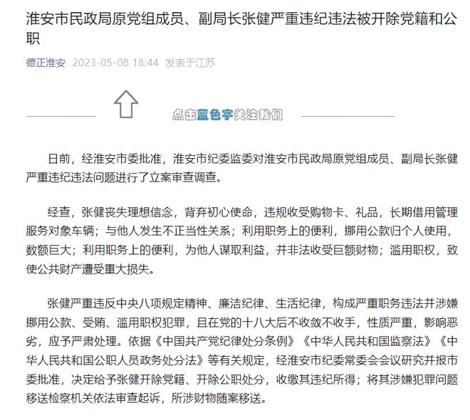 该消息显示,经淮安市委批准,淮安市纪委监委对淮安市民政局原党组成员、副局长张健严重违纪违法问题进行了立案审查调查。经查,张健丧失理想信念,背弃初心使命,违规收受购物卡、礼品,长期借用管理服务对象车辆;与他人发生不正当性关系;利用职务上的便利,挪用公款归个人使用,数额巨大;利用职务上的便利,为他人谋取利益,并非法收受巨额财物;滥用职权,致使公共财产遭受重大损失。