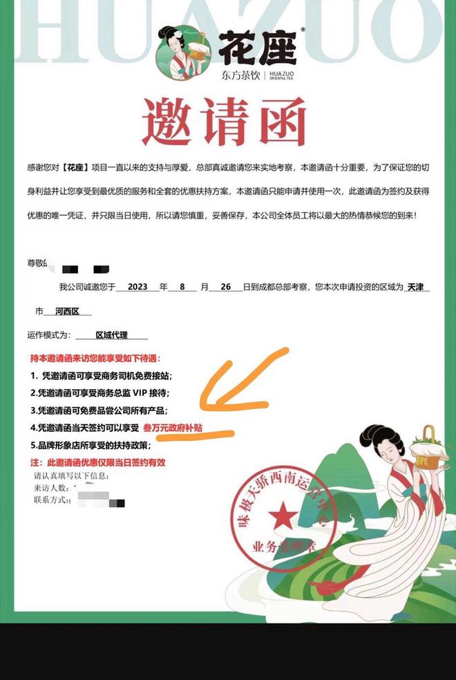 童童说,当时公司招商负责人介绍,他们的奶茶品牌叫“花座”,是“蜜雪冰城”的二级品牌,当地政府扶持会给每个门店补贴3万元的加盟费,门店开业后将提供达人探店、直播等推广扶持。