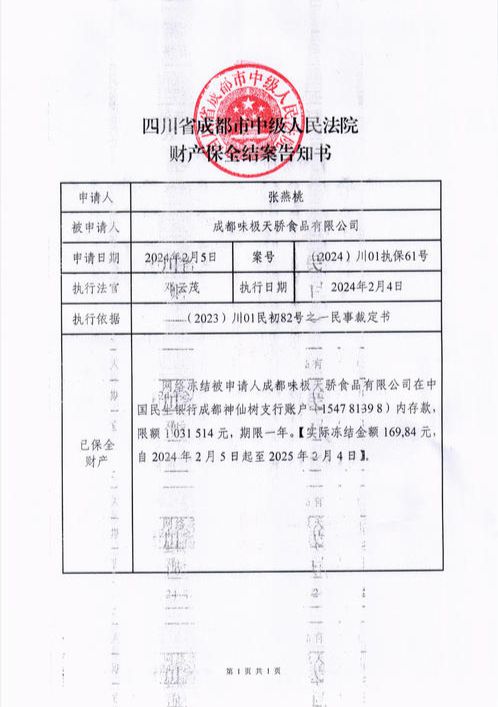 公开资料显示,成都味极天骄食品有限公司于2017年成立,今年2月该公司的注册资本从1029万元减少到了150万元,法人也在去年11月发生了转变。